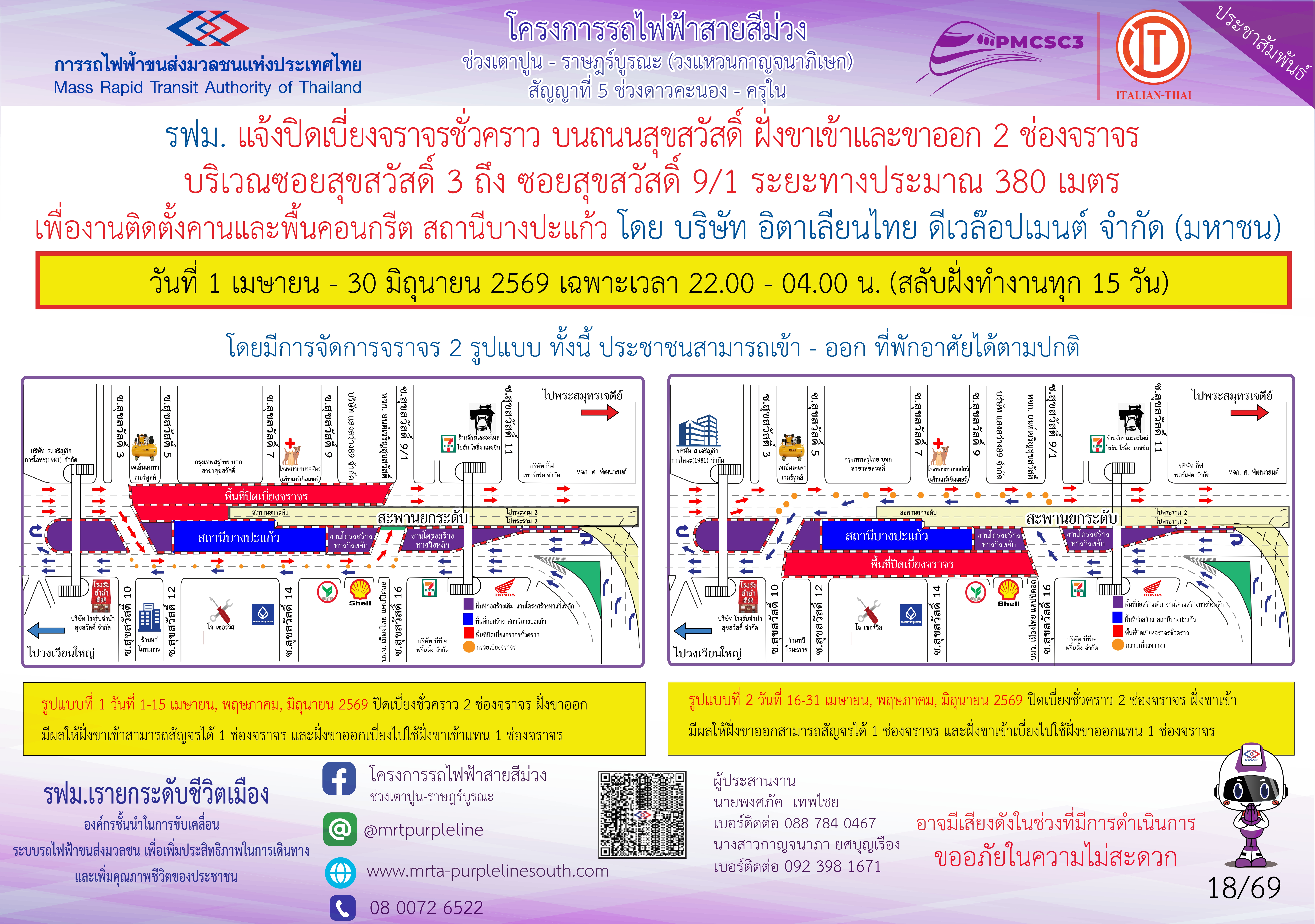 การรถไฟฟ้าขนส่งมวลชนแห่งประเทศไทย (รฟม.) แจ้งว่า บริษัท อิตาเลียนไทย ดีเวล๊อปเมนต์ จำกัด (มหาชน) ผู้รับจ้างงานก่อสร้างทางวิ่งและสถานียกระดับ อาคารจอดรถไฟฟ้าและอาคารจอดแล้วจร โครงการรถไฟฟ้าสายสีม่วง ช่วงเตาปูน - ราษฎร์บูรณะ (วงแหวนกาญจนาภิเษก) สัญญาที่ 5 ช่วงดาวคะนอง - ครุใน มีความจำเป็นต้องปิดเบี่ยงจราจรชั่วคราวบนถนนสุขสวัสดิ์ ฝั่งขาเข้าและขาออก 2 ช่องจราจร บริเวณซอยสุขสวัสดิ์ 3 ถึง ซอยสุขสวัสดิ์ 9/1 ระยะทางประมาณ 380 เมตร เพื่องานติดตั้งคานและพื้นคอนกรีต สถานีบางปะแก้ว วันที่ 1 เมษายน - 30 มิถุนายน 2569 เฉพาะเวลา 22.00 - 04.00 น. (สลับฝั่งทำงานทุก 15 วัน) โดยมีการจัดการจราจร 2 รูปแบบ ดังนี้